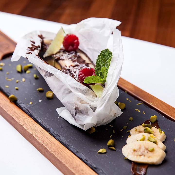 Fully ripe bananas and slow-melting Belgian bitter chocolate merge into a single taste sensation when oven-cooked together in foil and sprinkled with Cuban rum, coconut ice cream and lime fillets.