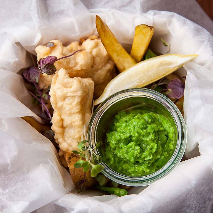 The classic among British classics: juicy cod coated in a hearty beer batter, served with mashed peas and chipped potatoes, sprinkled the traditional way with a dash of wine vinegar.