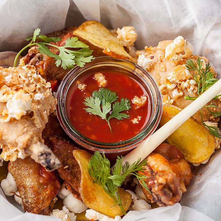 Street food deluxe: marinated chicken drumsticks in a caramel-popcorn crust plus spicy chicken wings with tomato-pineapple-coriander salsa served with country fries and caramelised popcorn.