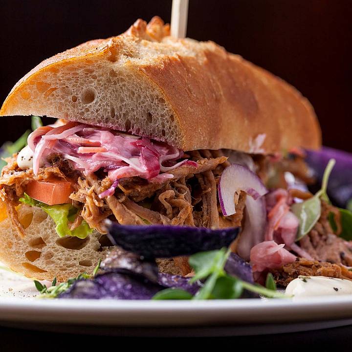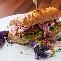 Spicy slow-cooked pork served in a crisp brick oven baguette with red coleslaw, blue potato chips and a mustard-thyme dip.
