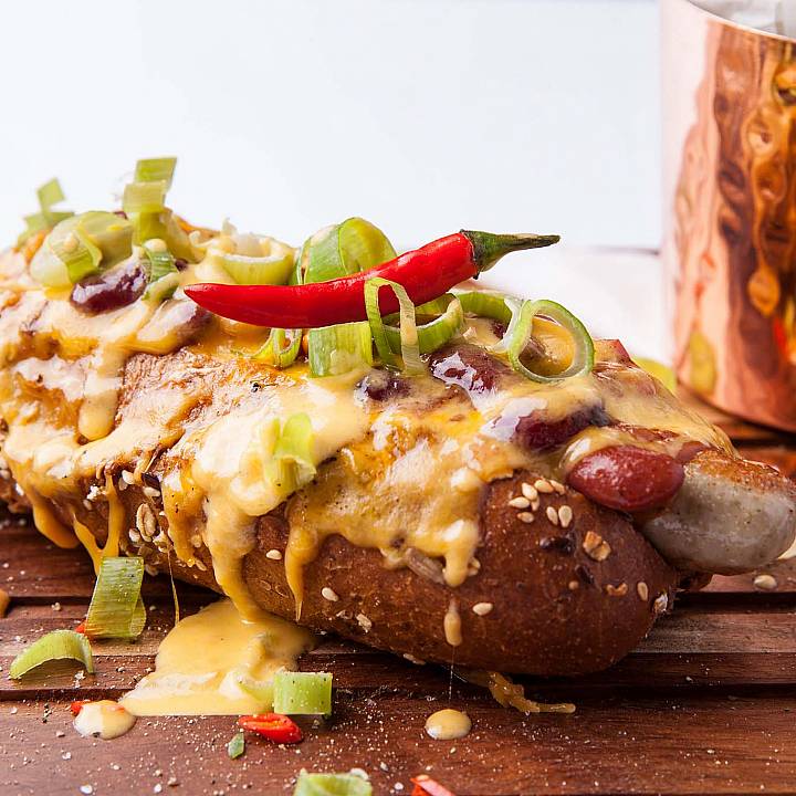 A must for hot dog lovers: homemade chili-veal bratwurst in an oven-fresh whole grain bun served with spicy-hot chili con carne, creamy cheddar sauce and country fries.
