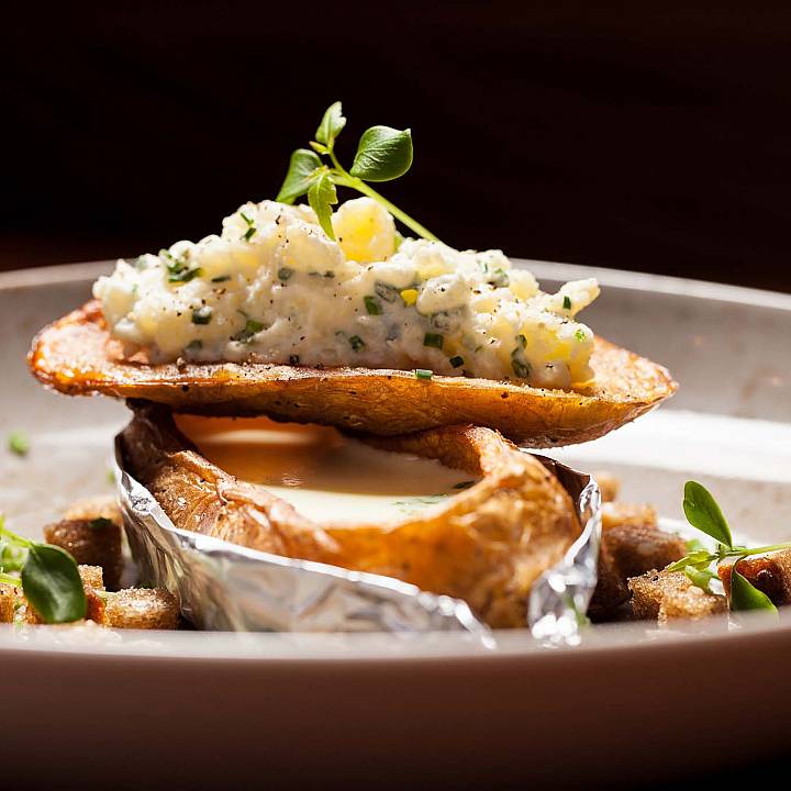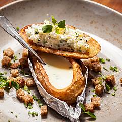 Served with chives, crispy dark bread cubes and baked potato spoon.